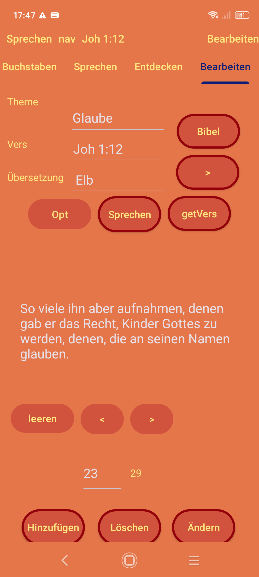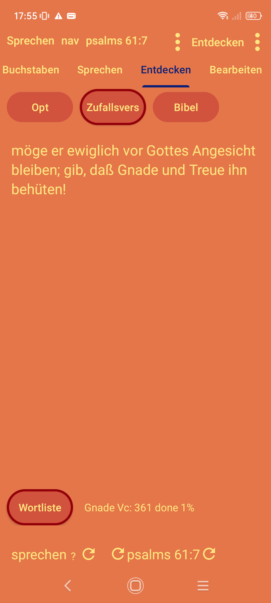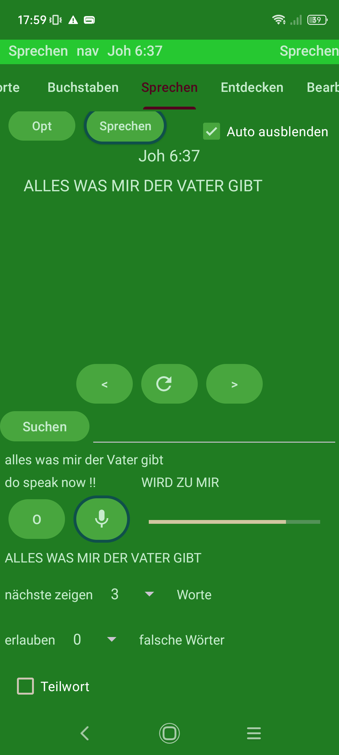 Startseite Worte klicken Worte sortieren Auf Buchstaben klicken Vorsprechen lassen .. aufsagen mit überprüfen Entdecken Bibelversliste bearbeiten und verwalten